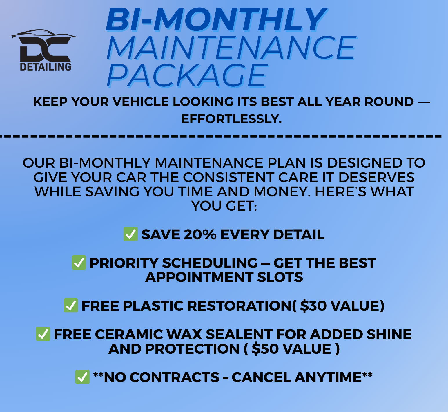 At DC Mobile Detailing, we know how important it is to keep your vehicle looking its best—not just once, but all year long. That’s why we offer our exclusive Car Detailing Maintenance Plan for drivers in Franklin, Tennessee and the surrounding areas. This plan is designed to save you money, protect your investment, and ensure your vehicle always looks fresh, clean, and well cared for AFTER BOOKING A DETAIL THAT INCLUDES AN INTERIOR DETAIL such as Deluxe Detail, Interior Detail , and in some circumstances Mini Details.